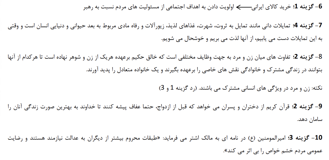 9- قرآن کریم چه توصیه ای برای دختران و پسران قبل از ازدواج بیان نموده است؟ (نسبتا دشوار – سراسری ریاضی 98)
