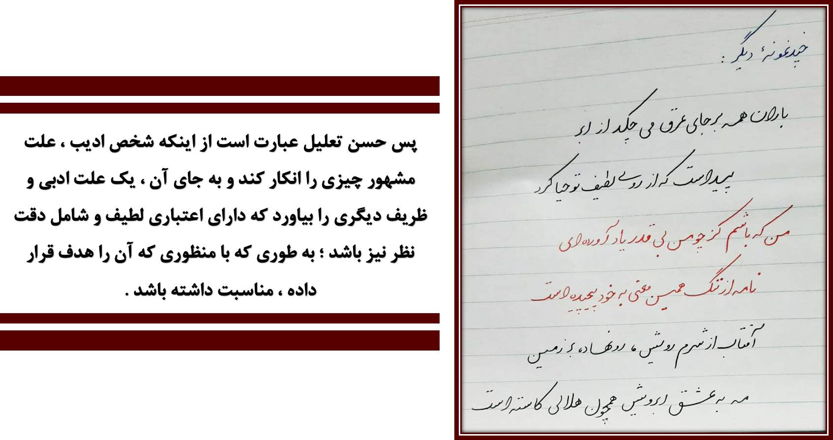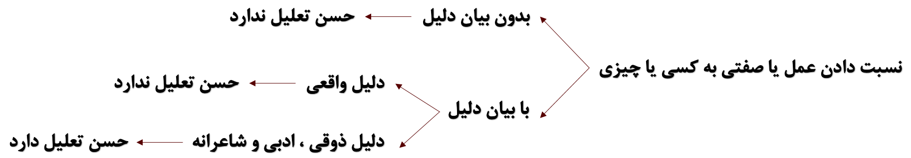 ◼️حسن تعلیل آن است که برای صفتی که در سخن آوردهاند ، علتی ذکر کنند که با آن مطلب ، مناسبت لطیفی داشته باشد و بیشتر ادبا شرط کردهاند که این علت باید ادعایی باشد نه حقیقی ، تا آنکه بیشتر زیباییآفرین باشد .◼️