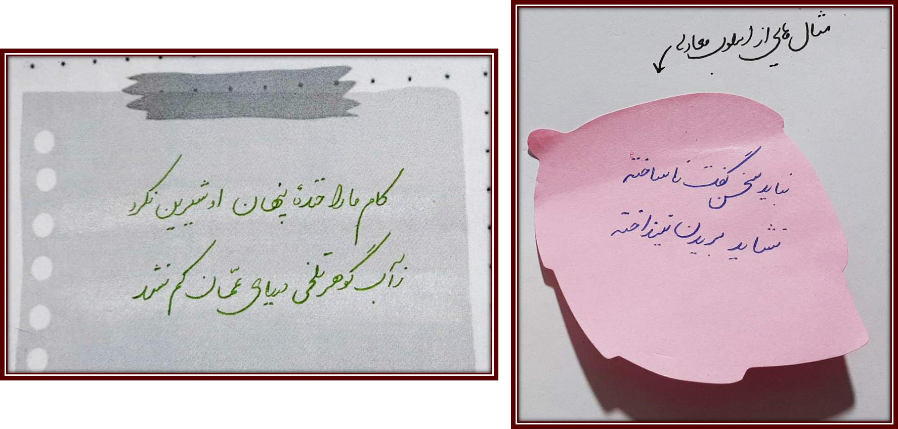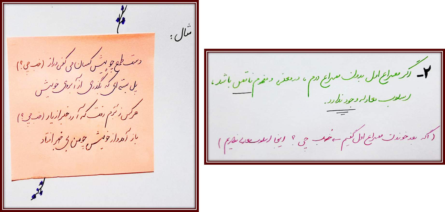 4. شاعر در یک مصراع ( غالبا مصراع اول ) موضوعی را مطرح میکند و سپس در مصراع بعد با آوردن مثال ، به تفهیم موضوع خود میپردازد .