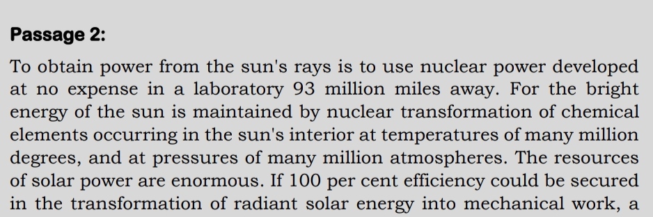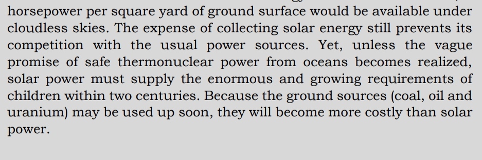 متن دوم: به دست آوردن برق از اشعه های خورشید یعنی استفاده کردن از نیروی هسته ای که بدون هیچ هزینه ای در آزمایشگاهی به فاصله 93 میلیون مایل دورتر به دست می آید. زیرا انرژی نورانی خورشید از تبدیل عناصر شیمیایی داخل خورشید در حرارت چندین میلیون درجای و تحت فشار چندین میلیون اتمسفر اتفاق می افتد. منابع انرژی خورشیدی بیکران است اگر در تبدیل انرژی تابشی خورشید به کار مکانیکی بتوان ۱۰۰ درصد راندمان آن را حفظ کرد ، زیر آسمان های صاف (نیرویی معادل) یک اسب بخار بر یارد مربع از سطح زمین حاصل خواهد شد. هنوز هزینه بالای به دست آوردن انرژی خورشیدی از رقابت آن با منابع متناول انرژی جلوگیری می کند. با وجود این ، اگر وعده نامعلوم استفاده از انرژی این گرما هسته ای از اقیانوس ها تحقق نباید انرژی خورشیدی باید تامین کننده نیازهای فراوان و روزافزون کودکان در دو قرن آتی باشد چون منابع زمینی (زغال سنگ، نفت و اورانیوم) ممکن است به زودی به طور کامل استفاده شود ، این منابع گران تر از انرژی خورشیدی خواهند شد