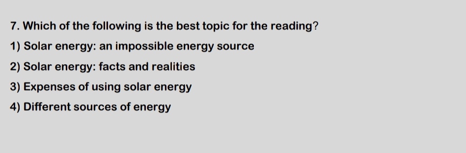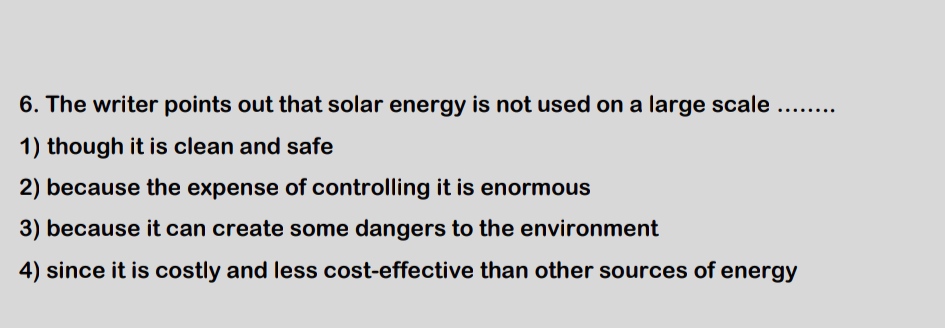 6 - گزینه (4) – نویسنده خاطرنشان می کند که انرژی خورشید در مقیاس بزرگ مورد استفاده قرار نمی گیرد ......