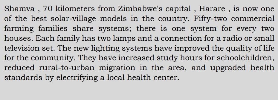 متن اول: در اوایل دهه ۱۹۹۰ بسیاری از روستاییان در بخش هایی از آفریقا (یعنی) جایی که زندگی به علت نبود الکتریسیته سخت بود، به استفاده از انرژی خورشیدی روی آوردند. شاید بزرگترین پروژه از این نوع و یکی که اغلب ذکر می شود پروژه زیمبابوه است که توسط UNDP از طریق (Global Environment Facility) حمایت می شود. این برنامه که توسط GEF (7 میلیون دلار) و زیمبابوه ( 400000 دلار) سرمایه گذاری شده ، برای بهبود استانداردهای زندگی در سرتاسر کشور و همچنین کاهش کیفیت زیستی زمین و آلودگی از ۹۰۰۰ سیستم انرژی خورشیدی استفاده کرد.