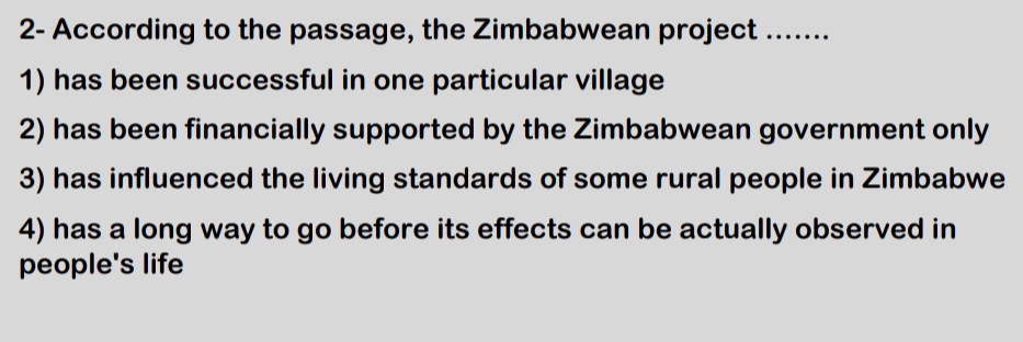 سوال 2 - گزینه (3) - « بر اساس متن، پروژه زیمبابوه بر استانداردهای زندگی بعضی از مردم روستایی در زیمبابوه اثرگذار بوده است.»