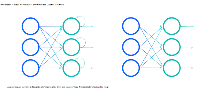 شبکه عصبی بازگشتی (RNN) گونهای از شبکه عصبی مصنوعیه که از داده ترکیبی (Sequential) یا داده سری زمانی (Time series) استفاده میکنه. این الگریتمهای یادگیریِ عمیق رو عموماً برای حل مسائل محدود و وصفی مانند ترجمه زبان، پردازش زبان طبیعی (NLP)، تشخیص صحبت (Speech recognition) و شرحنویسی عکس استفاده میکنن. نمونه این الگریتم رو میتونید تو جستجو با ویس و گوگل ترنسلیت ببینید. شبکه عصبی بازگشتی، مانند شبکههای عصبی حلقهای (Convolutional) و پیشخور (Feedforward)، از دادههای آموزشی برای یادگیری استفاده میکنه. مهمترین فرق این شبکه عصبی در حافظهش است. یعنی اطلاعات ورودیهای قبلی رو حفظ میکنه تا با اونا ورودی و خروجیهای بعدی رو تحت تاثیر قرار بده. به عبارت دیگه در شبکههای عصبی قدیمی ورودی و خروجی مستقل از هم فرض میشدن، درحالی که در این شبکه خروجی وابسته و متاثر از عناصری است که از قبل در شبکه حضور دارن. در تصویر زیر تفاوت شبکه عصبی پیشخور (سمت راست) و بازگشتی (سمت چپ) رو مشاهده میکنید.