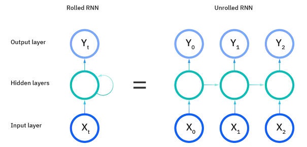 در تصویر زیر شکلِ حلقهای RNN نشاندهنده کل شبکه عصبی یا کل عبارت پیشبینی شده است. در حالی که شکل غیر حلقهای (unrolled) تک تک لایهها یا مراحل زمانیِ شبکه رو نشون میده. هر لایه به یه واژه در عبارتمون دلالت داره مانند Weather. ورودیهای قبلی مانند feeling و under به عنوان مرحله پنهان در مراحل سوم استفاده میشن تا شبکه عصبی بتونه the رو پیشبینی کنه.