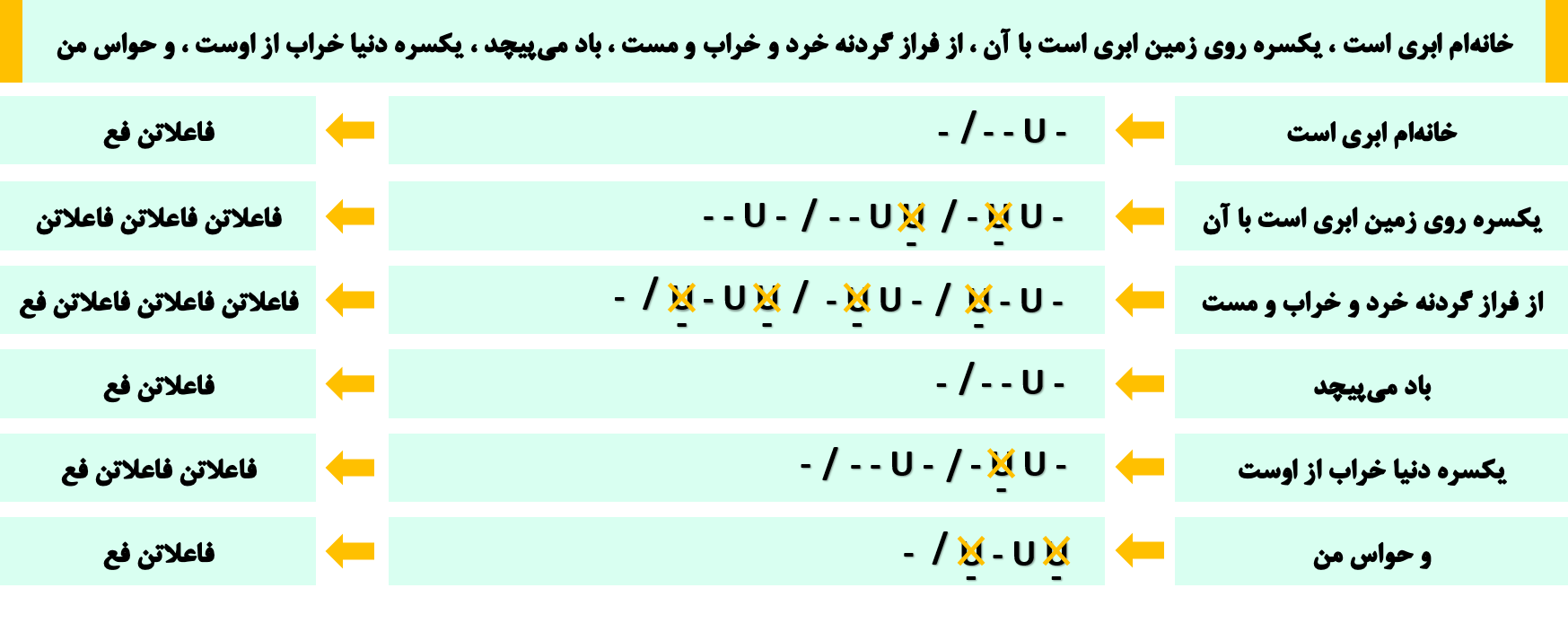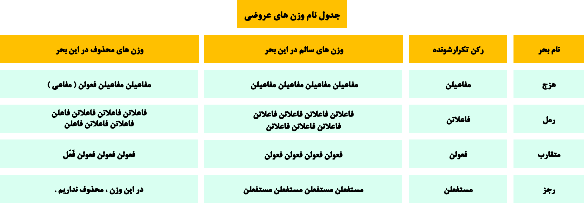 1. فاعلاتن 2. فعلاتن 3. فعلن 4. فعلات
