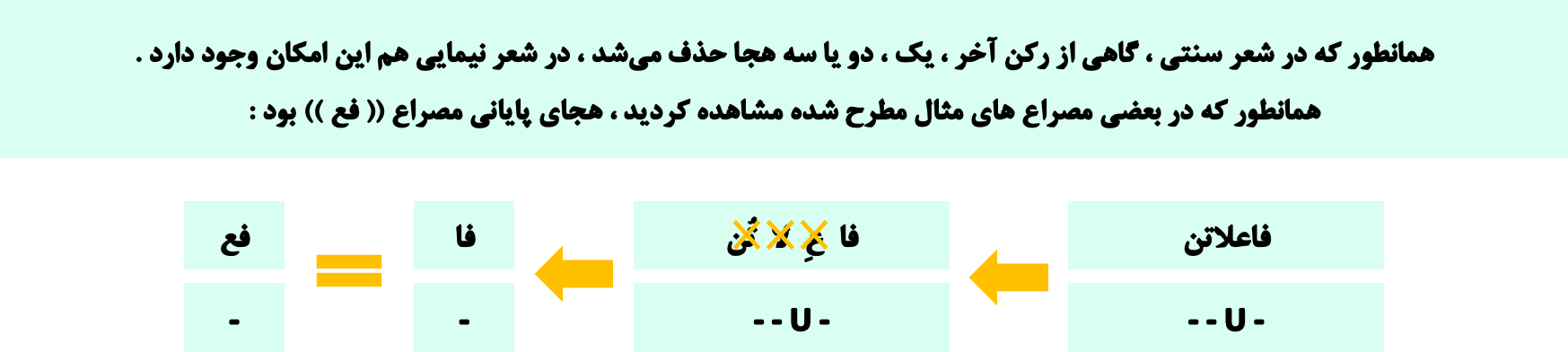 🟡در بسیاری از مواقع ، یک یا چند هجا از رکن پایانی مصراع حذف میشد ، اگر یک هجا حذف شود ، بیت را (( محذوف )) مینامند.🟡