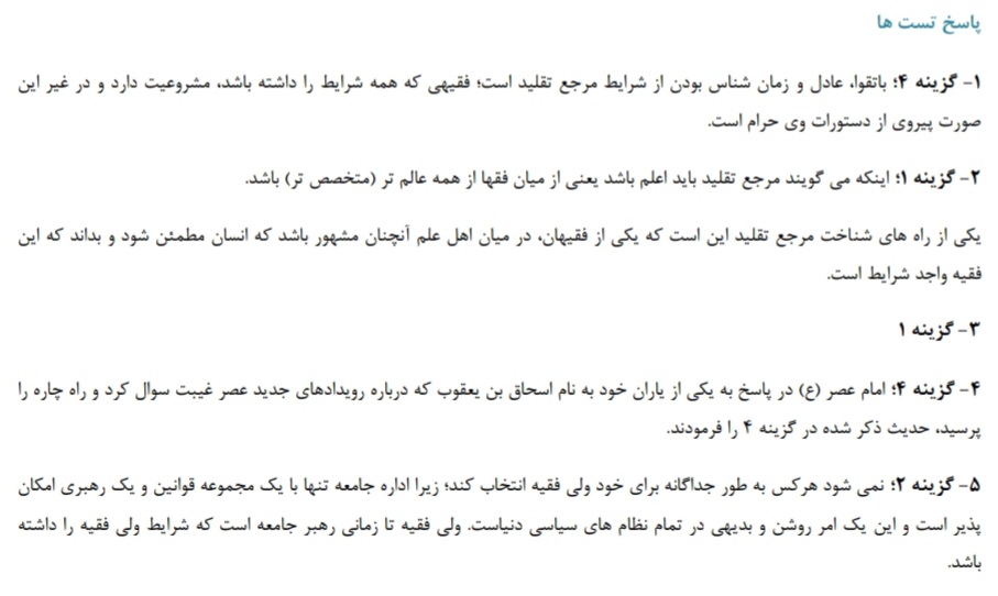 1- مرجع تقلید علاوه بر تخصص در فقه باید دارای چه شرایطی باشد تا مشروعیّت پیدا کند و در غیر این صورت پیروی از دستورات وی چه حکمی دارد؟ (متوسط – سراسری ریاضی 98)