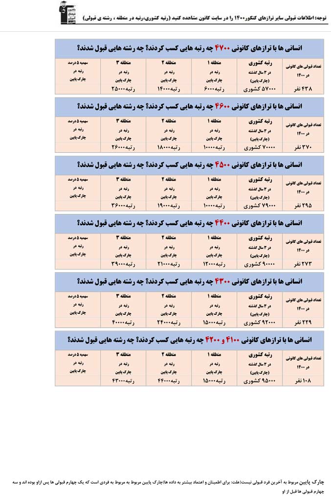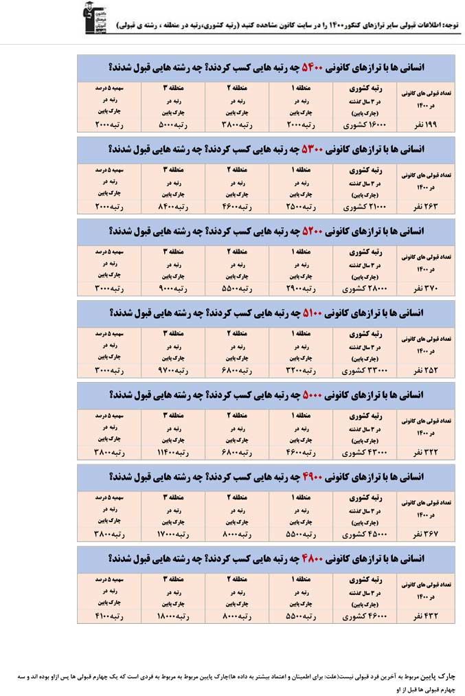 توجه : این اطلاعات فقط مربوط به قبولی های کانونی ها در کنکور 1400 می باشد.