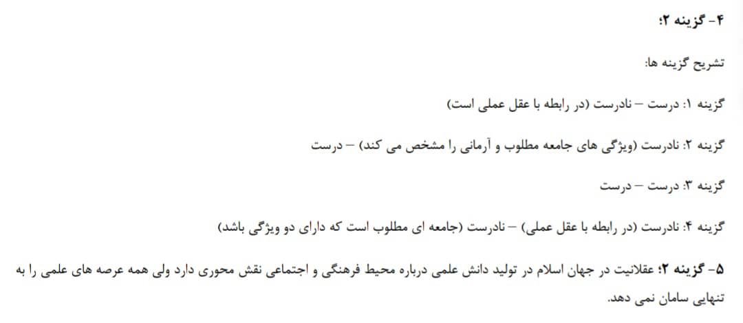4- کدام گزینه به ترتیب در رابطه با علم فقه، نادرست و در رابطه با ویژگی های جامعه مطلوب از نظر فقه شیعه، درست است؟ (متوسط - آزمون کانون، ۱۷ اردیبهشت ۱۴۰۰)