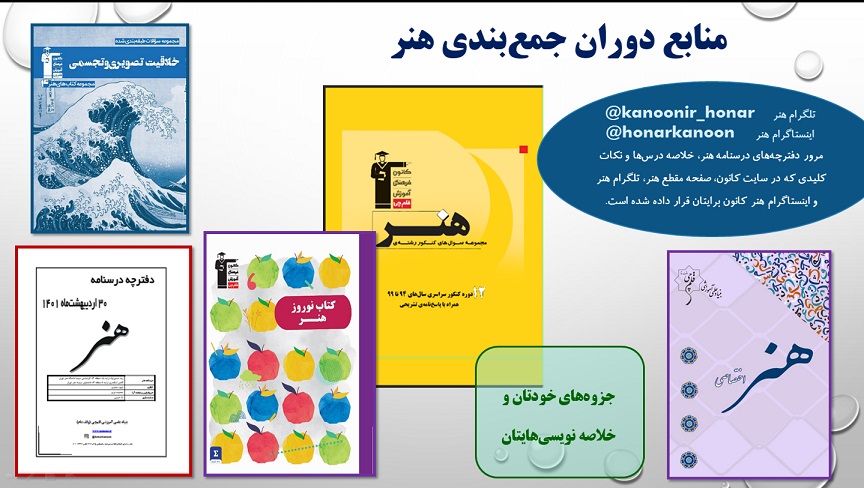 پیشنهاد هفتم نگاهی کوتاه به خلاصهها و نکتههایی که در سایت کانون صفحه مقطع هنر و یا کانال تلگرام هنر قرار گرفته است.