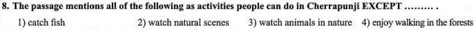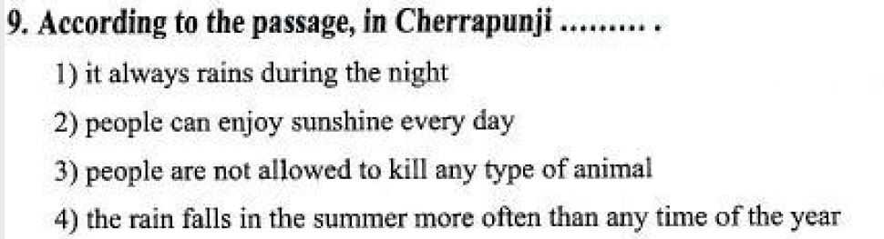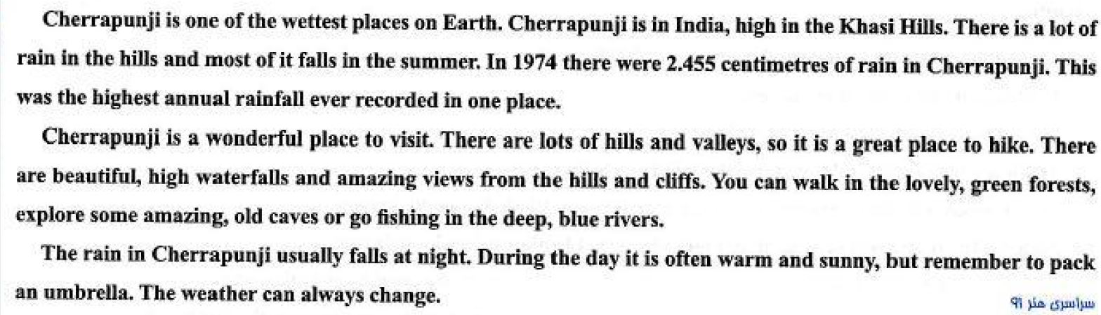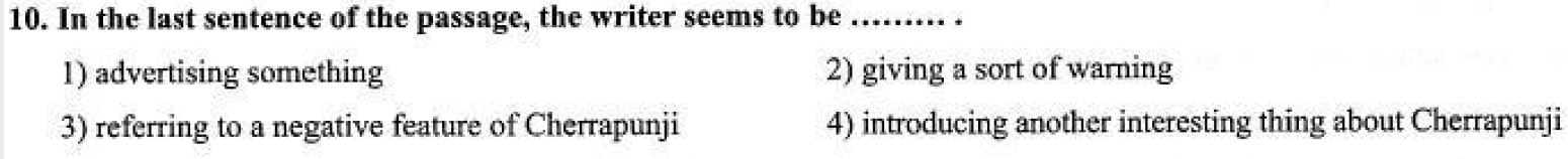 این هم یک سوال خاص در سوالات درک مطلب ریدینگ کنکور می باشد، که هدف یک پاراگراف یا یک جمله را می پرسد. با نگاه اجمالی به جمله آخر متوجه می شویم که به ما هشدار می دهد که موقع سفر به چراپونجی همیشه چتر همراه خود داشته باشیم پس یک هشدار به ما می دهد. پس گزینه 2 صحیح است.