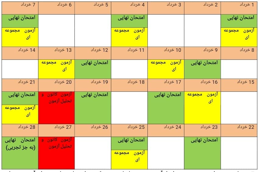 جدولِ دو: در این جدول بیشترِ اوقات، آزمونِ مجموعهای در همان روزِ امتحانِ نهایی اجرا میشود. هدف این است که از زمانِ روزهای امتحانِ نهایی بیشتر استفاده شود.