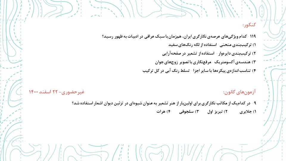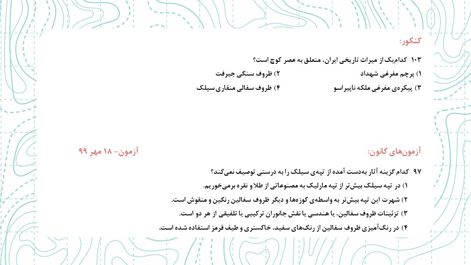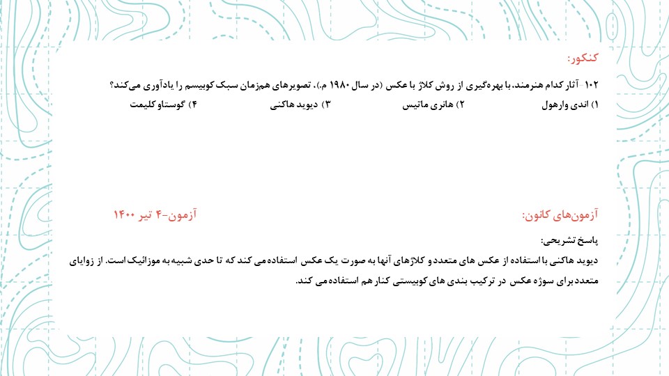 هر سال سوالات کنکور رو با آزمونهای برگزار شده چک میکنیم و سوالاتی که مشابه کنکور بودن رو مشخص میکنیم. این مشابهت فقط روی فرم سوال بررسی میشه و قسمت دفترچهی پاسخ رو ملاک قرار نخواهیم داد.