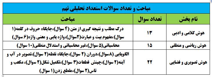 آزمون تیزهوشان نهم شامل دو دفترچه استعداد تحلیلی و استعداد تحصیلی است.دفترچه اول دو آزمون تیزهوشان نهم و ششم از نظر مباحث مشابه یکدیگرند و معمولا هر سال سوالات دو آزمون تیپ های مشابهی دارند.تعداد سوالات و بودجه بندی هر کدام از مباحث دفترچه استعداد تحلیلی تیزهوشان نهم و ششم امسال مطابق جدول زیر است.