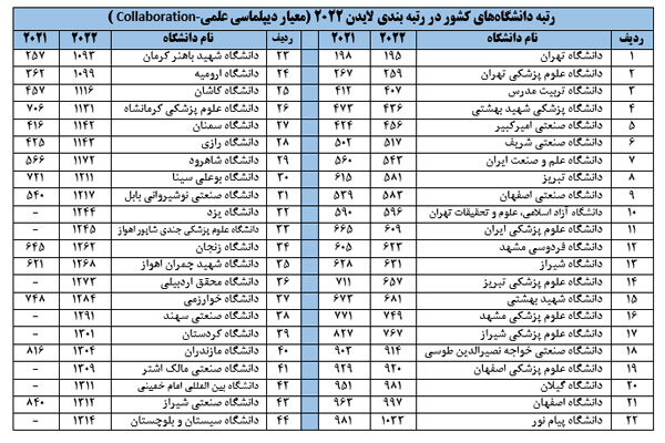 رتبه دانشگاههای کشور در رتبه بندی لایدن ۲۰۲۲ (معیار دیپلماسی علمی Collaboration)