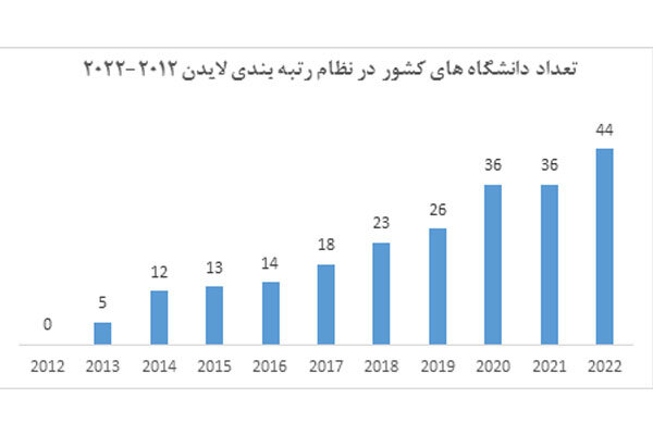 به گزارش خبرگزاری مهر به نقل از مؤسسه استنادی علوم و پایش علم و فناوری (ISC)، دکتر منصوره صراطی مدیر گروه رتبه بندی ISC گفت: نظام رتبهبندی لایدن، نتایج رتبهبندی دانشگاههای برتر دنیا در سال ۲۰۲۲ میلادی خود را منتشر کرد. در رتبهبندی سال جاری این نظام، تعداد ۴۴ دانشگاه از ایران در جمع ۱۳۱۸ دانشگاه برتر جهان قرار گرفتند. این در حالی است که در سال قبل ۳۶ دانشگاه از ایران در این رتبه بندی حضور داشته اند.