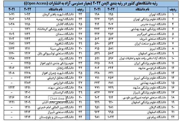 رتبه دانشگاههای کشور در رتبه بندی لایدن ۲۰۲۲ (معیار دسترسی آزاد به انتشارات (Open Access))