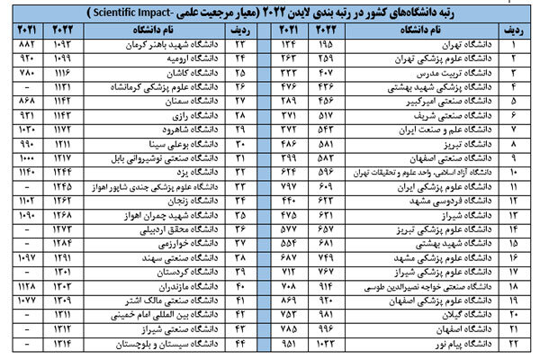 رتبه دانشگاههای کشور در رتبه بندی لایدن ۲۰۲۲ (معیار مرجعیت علمی Scientific Impact)