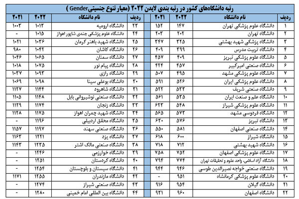 رتبه دانشگاههای کشور در رتبه بندی لایدن ۲۰۲۲ (معیار تنوع جنسیتی Gender)