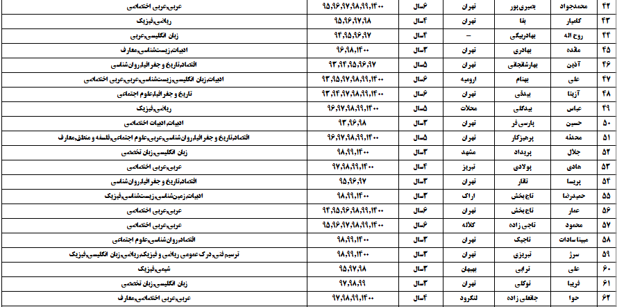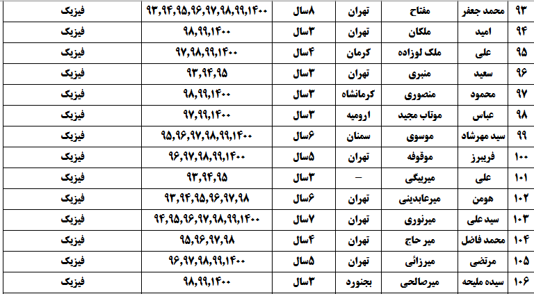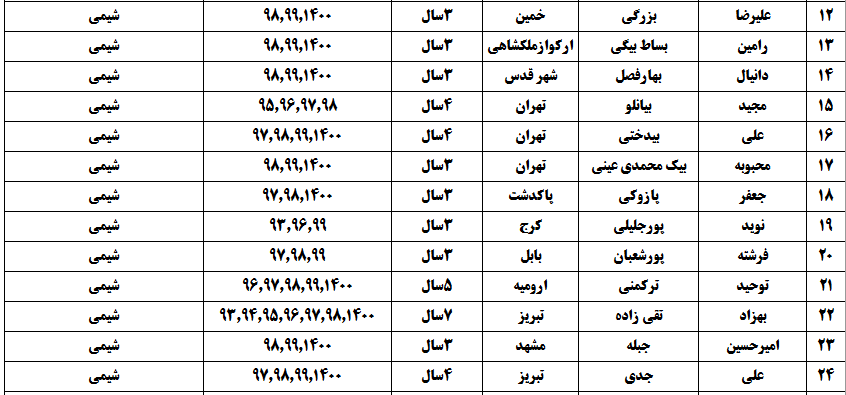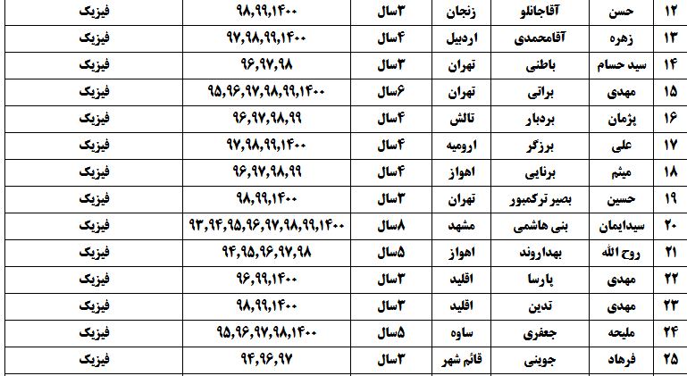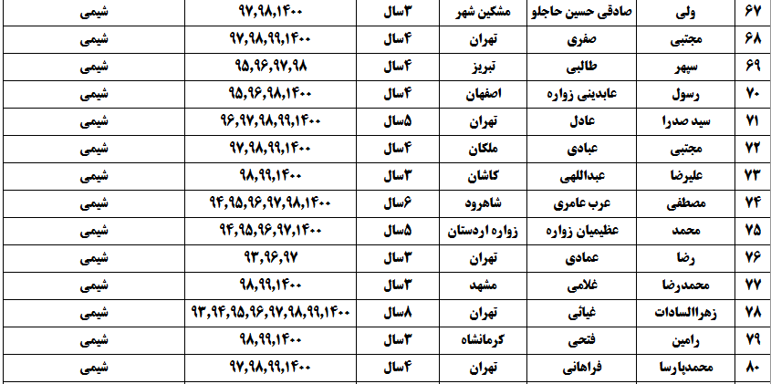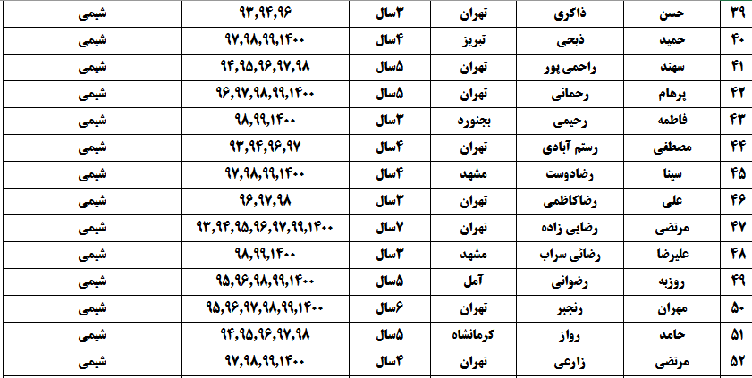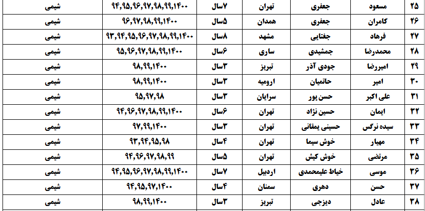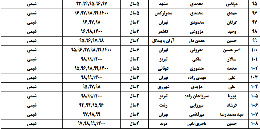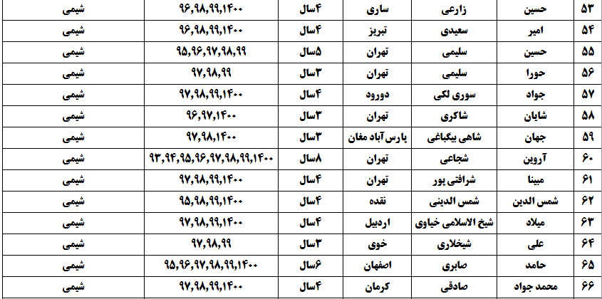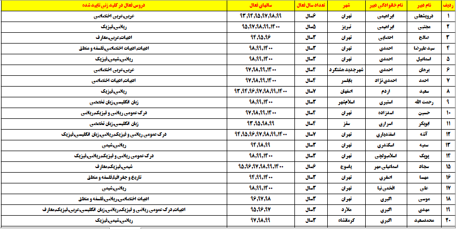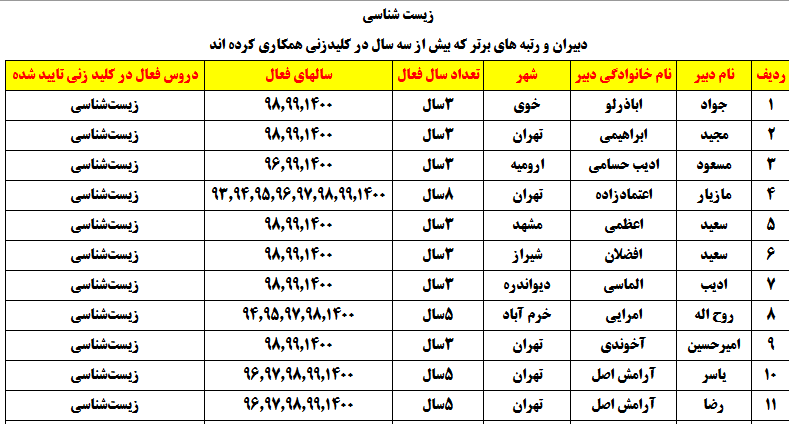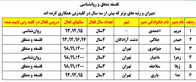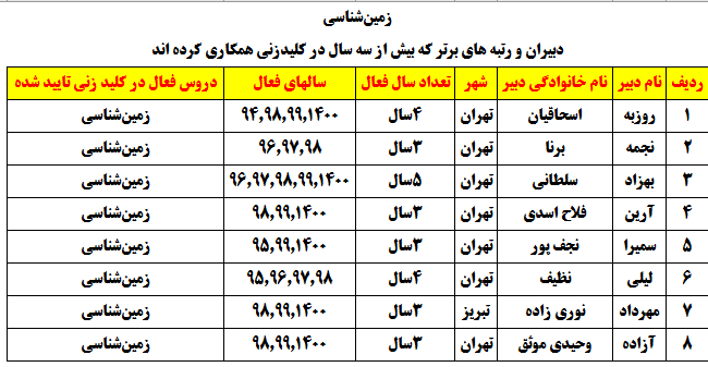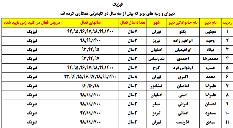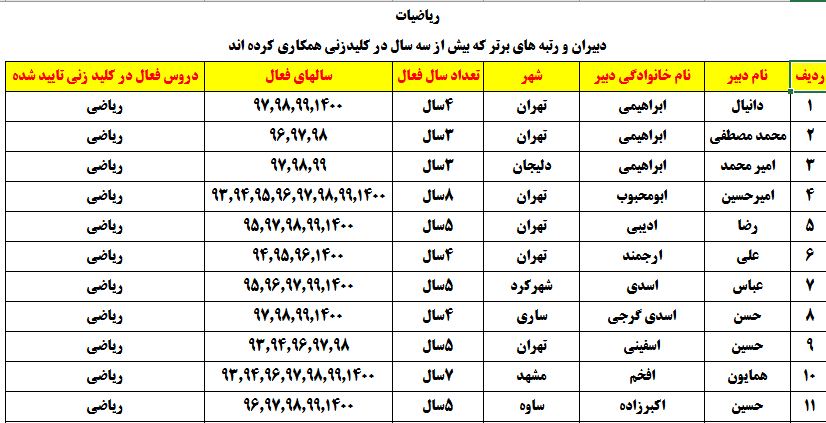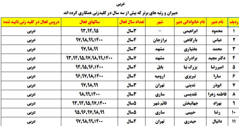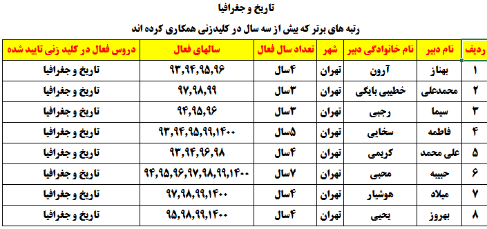درجدول ذیل نام دبیران و رتبههای برتر را که بیش از سه سال متوالی در این پروژه پرهیجان و علمی شرکت کردهاند، که مرتب شده بر اساس نام درس و نام دبیر است را مشاهده میکنید: