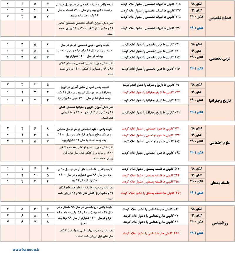در جدول های زیر سطح دشواری کنکور در سه سال گذشته را میبینید: