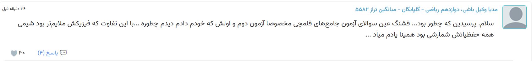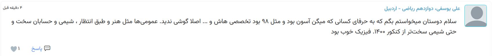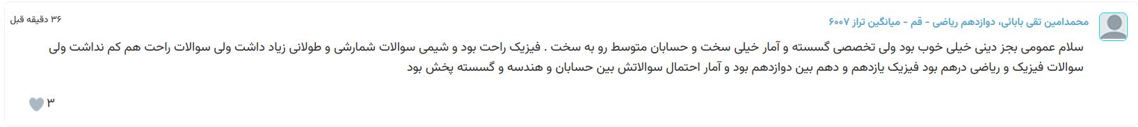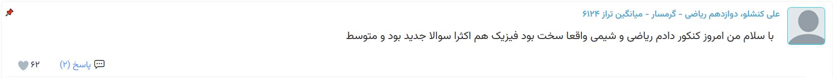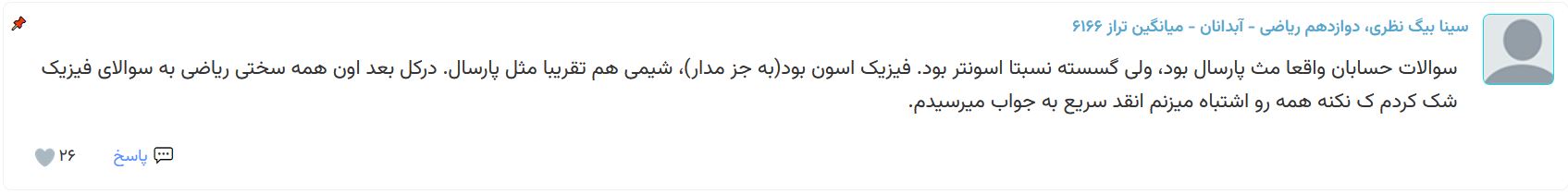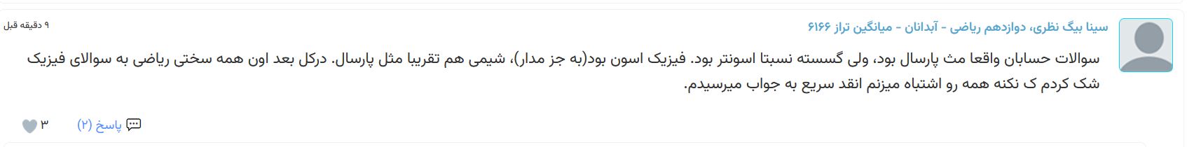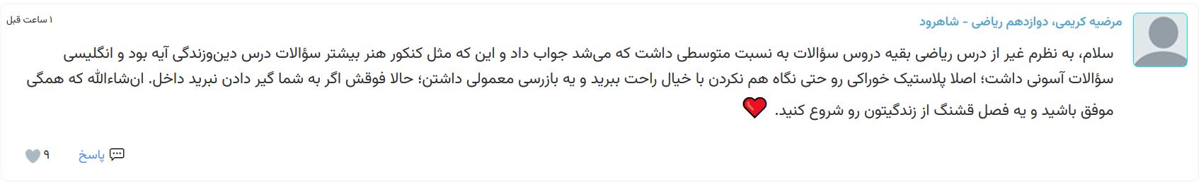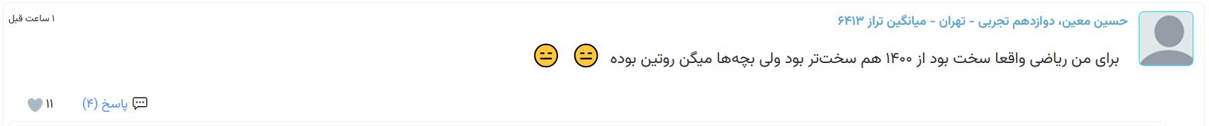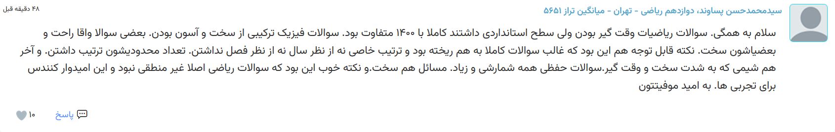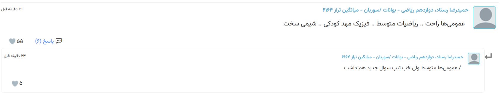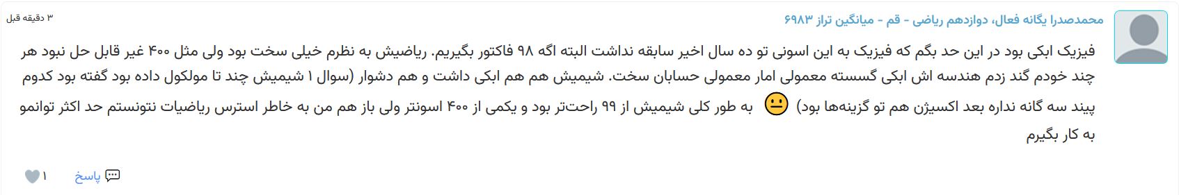 پس از برگزاری آزمون ها تعداد زیادی کامنت درباره ی سطح دشواری آزمون ها داشتیم. در این میان اظهار نظر دانش آموزانی که با صفحه ی شخصی خودشان نظر دادند قابل اعتمادتر است زیرا دارای هویت مشخص و سطح تراز دانش آموز است و معلوم می شود اگر دانش آموزی می گوید سوال های یک درس از نظر او ساده یا دشوار بوده است وضعیت درسی خود او چگونه است. اکنون که این مطلب را مطالعه می کنید در صورتی که خود شما هم تمایل دارید می توانید نظر خود را از طریق صفحه ی شخصی تان در قسمت کامنت ها (نظرات) بنویسید.