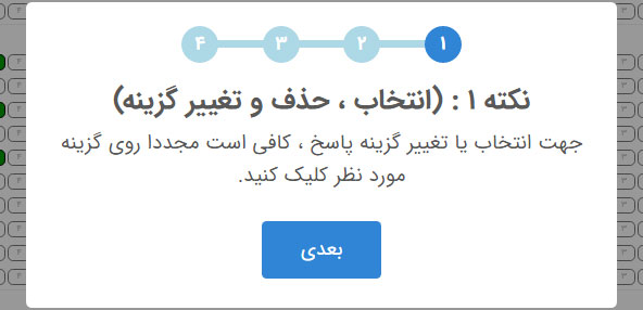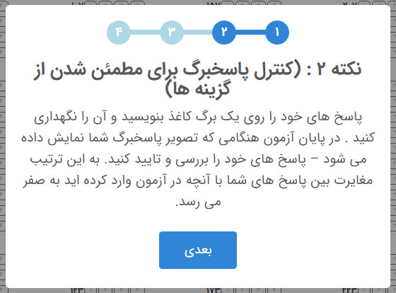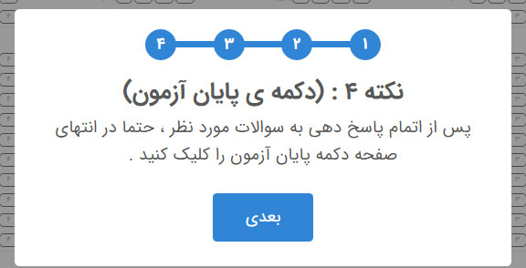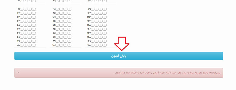 4-برای اتمام آزمون می بایست کلید پایان آزمون را در انتهای پاسخبرگ کلیک کند.