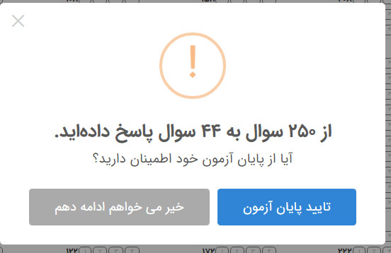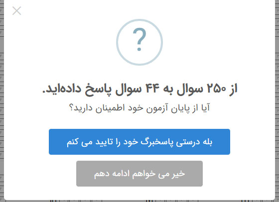 6- دو پیغام که بعد از کلیک برروی گزینه اتمام آزمون مشاهده می کنید.