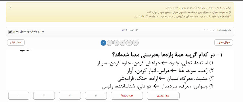 اگر آزمون را به صورت سوال به سوال پاسخ می دهید تصویر بالای صفحه را به شکل زیر مشاهده می کنید.