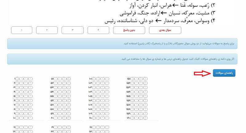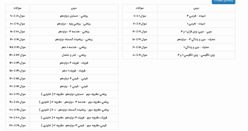 3-اگر روی دکمه ی راهنمای سوالات کلیک کنید کادر زیر نشان داده می شود.این جدول شامل نام درس ها و شماره ی سوال ها است.