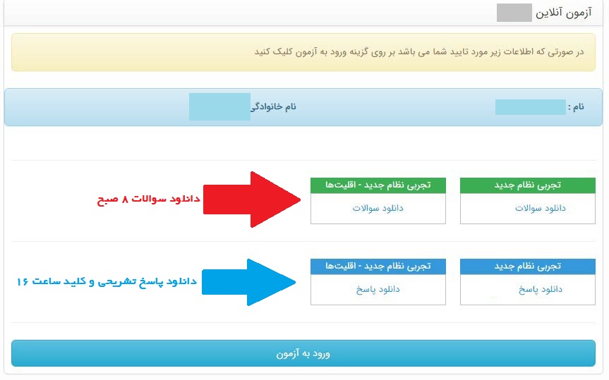 شما می توانید یک ربع قبل از شروع آزمون ( یک ربع به 8) دفترچه ی سوال ها را دانلود کنید و پرینت بگیرید