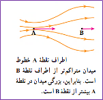 2. میزان تراکم خطوط میدان در هر ناحیه از فضا نشان دهنده اندازه میدان در آن ناحیه است؛ هرجا خطوط میدان متراکمتر باشد، ندازه میدان بیشتر است.
