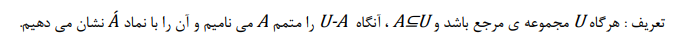 نکته : اگر مجموعه ی مرجع متناهی باشد ، تمام مجموعه ها متمم آنها نیز متناهی هستند، اما وقتی مجموعه نا متناهی باشد، نظر قطعی نمیتوان داد.