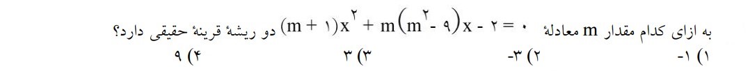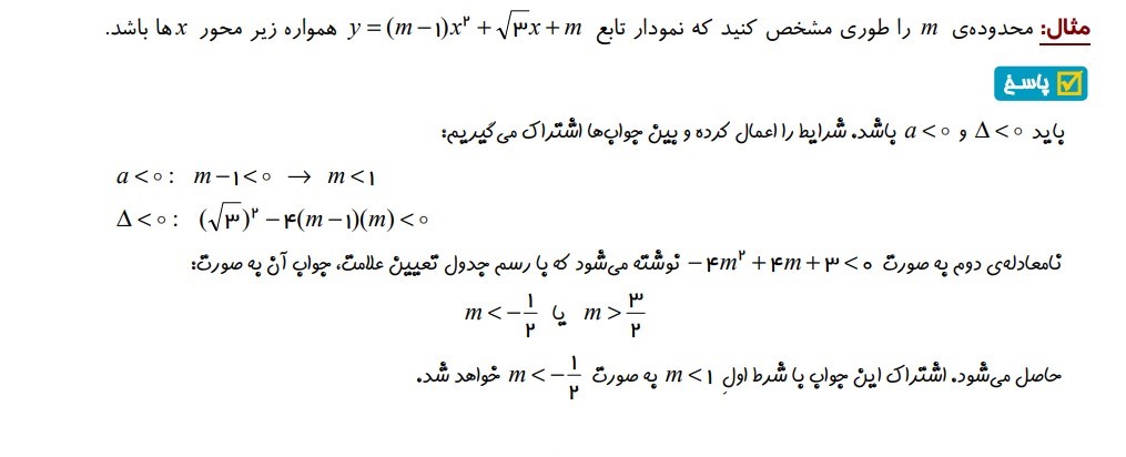 مثال 5 : (تعیین محدوده m با توجه به تعداد ریشه های تابع و بالا یا پایینِ محور yها بودن نمودار)