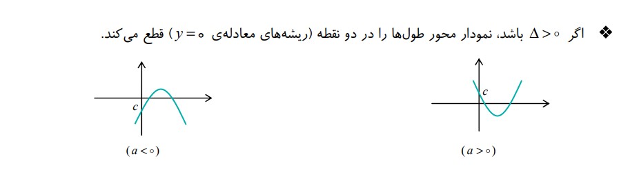 (حالات مختلف تعداد ریشه های نمودار سهمی با توجه به تغییر علامت ضریب a و علامت دلتا)