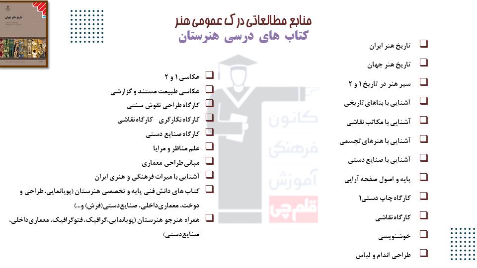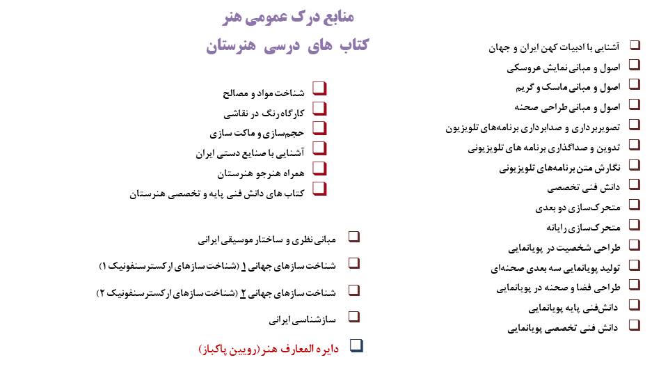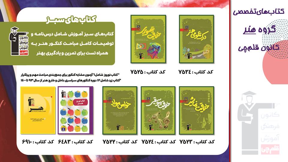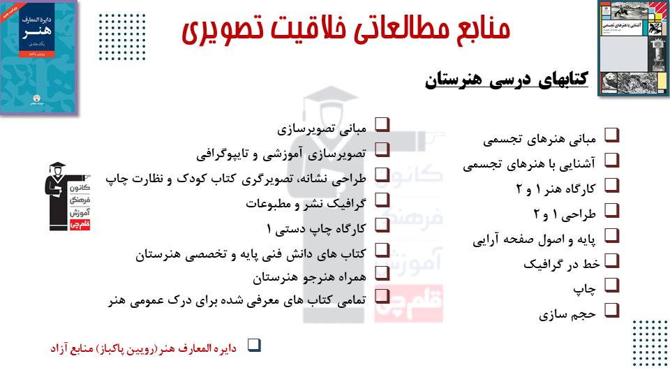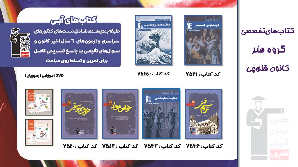 با توجه به کنکورهای هنر در سه سال گذشته و معرفی منابع کنکور هنر از سوی سازمان سنجش، لیست کتابهای مطالعاتی که باید برای دروس تخصصی کنکور هنر مطالعه نمایید را در هر درس برایتان مشخص کردهایم. داوطلبان کانون با توجه به برنامه راهبردی میتوانید کتابها را الویتبندی کنید.