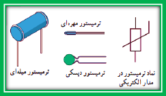 1.ترمیستور: نوعی مقاومت متغیر حساس به دما است که به وسیله تغییرات دمایی، مقاومتش تغییر میکند. در واقع با اندازه گیری مقاومت یک ترمیستور، میتوان دمای آنرا تعیین نمود. به همین دلیل این ابزار بعنوان سنسور دما مورد استفاده قرار میگیرند . ترمیستورها معمولاً از مواد نیمه رسانا تشکیل شده اند. از این رو در دماهای بالا، زودتر خراب شده و عمر کوتاهتری دارند . مقاومت اغلب آنها با افزایش دما افزایش مییابد که به این نوع پیتیسی PTC گفته میشود و در برخی از انواع دیگر مقدار مقاومت با افزایش دما کاهش مییابد که اصطلاحاً به آنها اِنتیسی NTC یا مقاومت دارای ضریب دمایی منفی گفته میشود . ترمیستورها شکل های متفاوتی دارند که عبارتند از دیسکی ، مهره ای و میله ای.