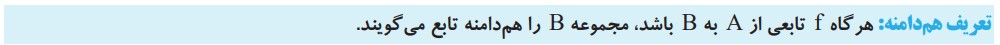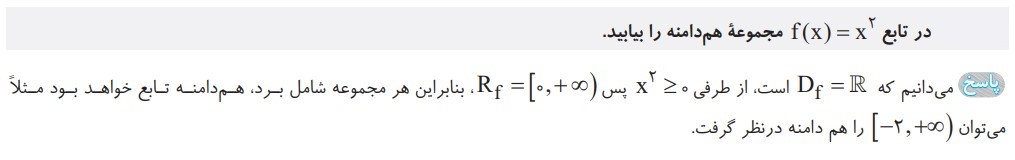 تذکر : حتما باید مجموعه ای را به عنوان هم دامنه تابع انتخاب کرد که همه ی عضو های برد در این مجموعه باشند ( حتی اگر مجبور باشیم خود مجموعه برد تابع را به عنوان هم دامنه انتخاب کنیم! )