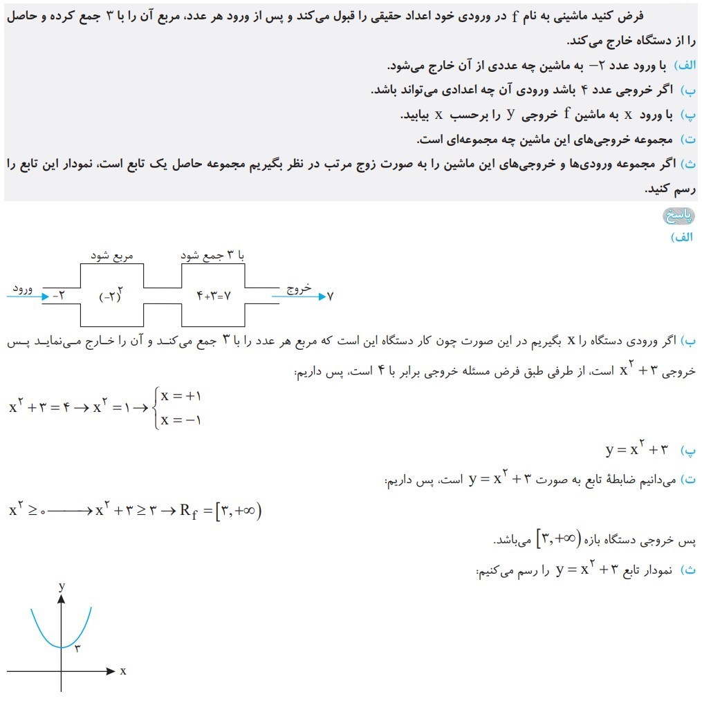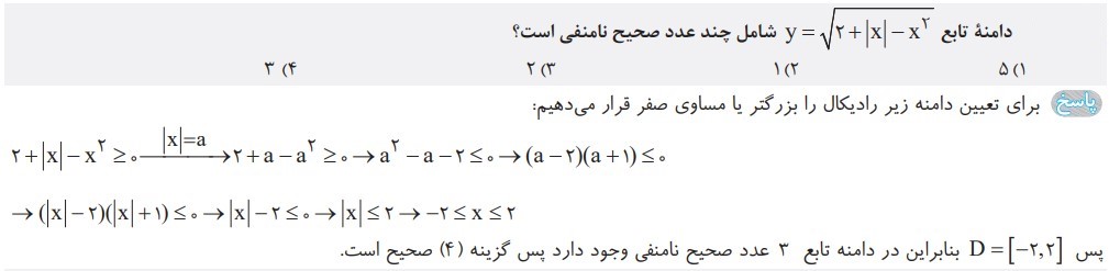 مثال 9 : ( تعیین دامنه تابع و بررسی وجود عددی مشخص در برد تابع )