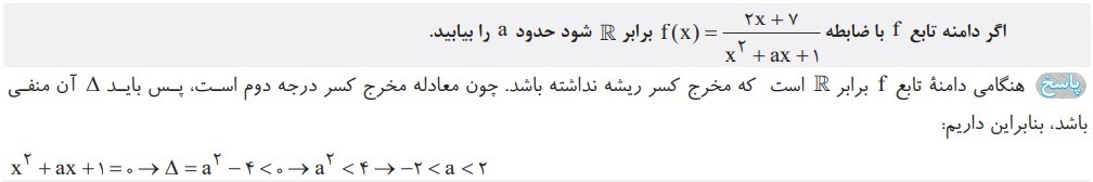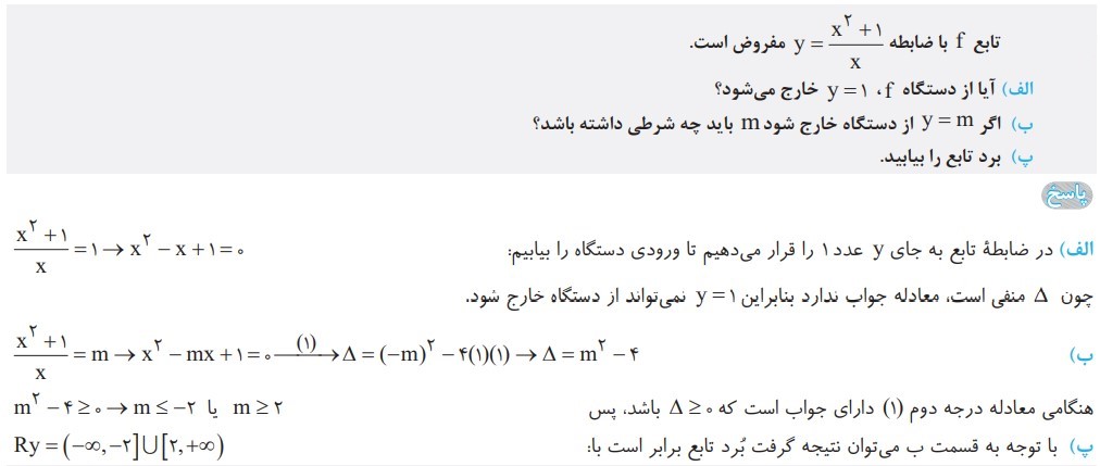 مثال 10 : ( تعیین دامنه تابع و بررسی وجود عددی مشخص ( به صورت متغیر ) در برد تابع )