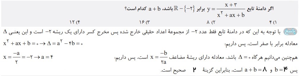 مثال 7 : ( حالت دیگری از دامنه یابی ، با استفاده از تعداد ریشه های مخرج و علامت دلتا )