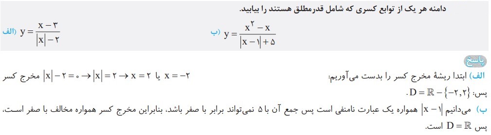 مثال 11 : ( تعیین دامنه توابع شامل قدر مطلق )
