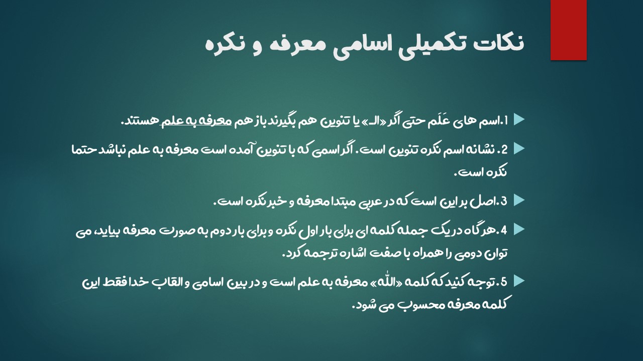 «قيِّمةٌ» خبر است كه همراه با تنوين و نكره آمده است، اما میتوان آن را معرفه ترجمـه كرد: «پندِ نيكو از معلّم برای همهٔ همشاگردیها ارزشمند است!» نكتهٔ مهم درسیگاهی خبر به ويژه زمانی كه يک اسم نكره اسـت، تنـوين دارد، ولی بـه صـورت معرفـه ترجمه میشود.