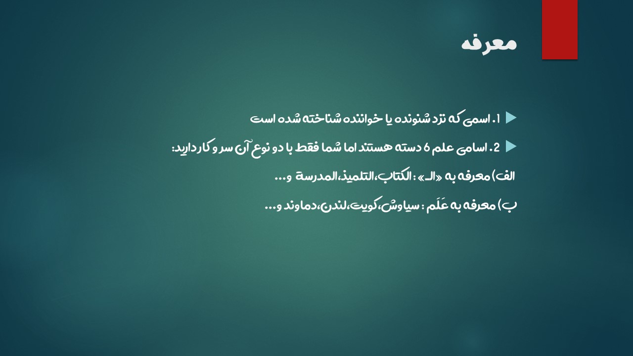 پاسخ تشریحی :«طالبٌ و مشاغبٌ» اسم فاعل هستند، ولی معرفه نیستند.در سایر گزینهها بهترتیب کلمات زیر اسم فاعل و معرفه هستند:1) القادمة 3) المُدرِّس 4) الخانِقة