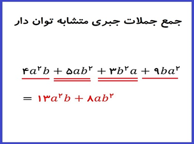 جمع و تفریق جمله های جبری: در یک عبارت جبری فقط می توان جمله های متشابه را با هم جمع و یا از هم کم کرد.