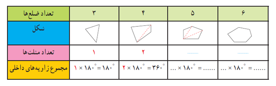 زاویه هایی که درون یک چندضلعی قرار دارند، زاویه های داخلی آن چندضلعی نامیده می شوند. مجموع زاویه های داخلی یک مثلث 180 درجه است.