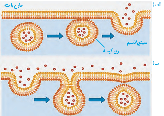 ۴) برون رانی- کیسه های غشایی محتوی ذره های بزرگ با مصرف ATP در غشا ادغام می شوند.