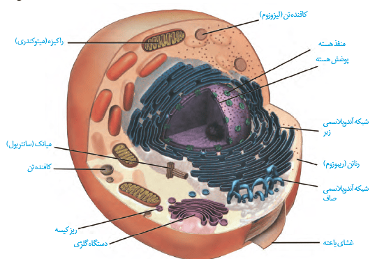 اندامک های سلول جانوری: رناتن (ریبوزوم)، شبکه آندوپلاسمی زبر، شبکه آندوپلاسمی صاف، هسته، دستگاه گلژی، راکیزه (میتوکندری)، کافندهتن (لیزوزوم)، میانک (سامتریول)، ریزکیسه (وزیکول)