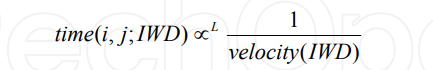یه راه برای بهبود فرمول بالا میتونه فرمول پایین باشه که در اون time(i,j;velIWD) زمانی رو نشون میده که IWD نیاز داره (velIWD) تا از نقطه i به نقطه j برسه. خاکی که به IWD اضافه میشه اینجوری محاسبه میشه: